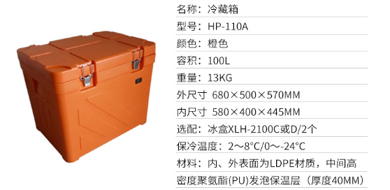 【内部容积】110L/升 【内外材质】PP 【保温材质】PU聚氨酯整体发泡 【加工工艺】吹+注塑工艺 【温度类型】冷藏2-8℃|冷冻-12~-22℃|超低温-36~-55℃ 【适用范围】可用于需物理方式保温...